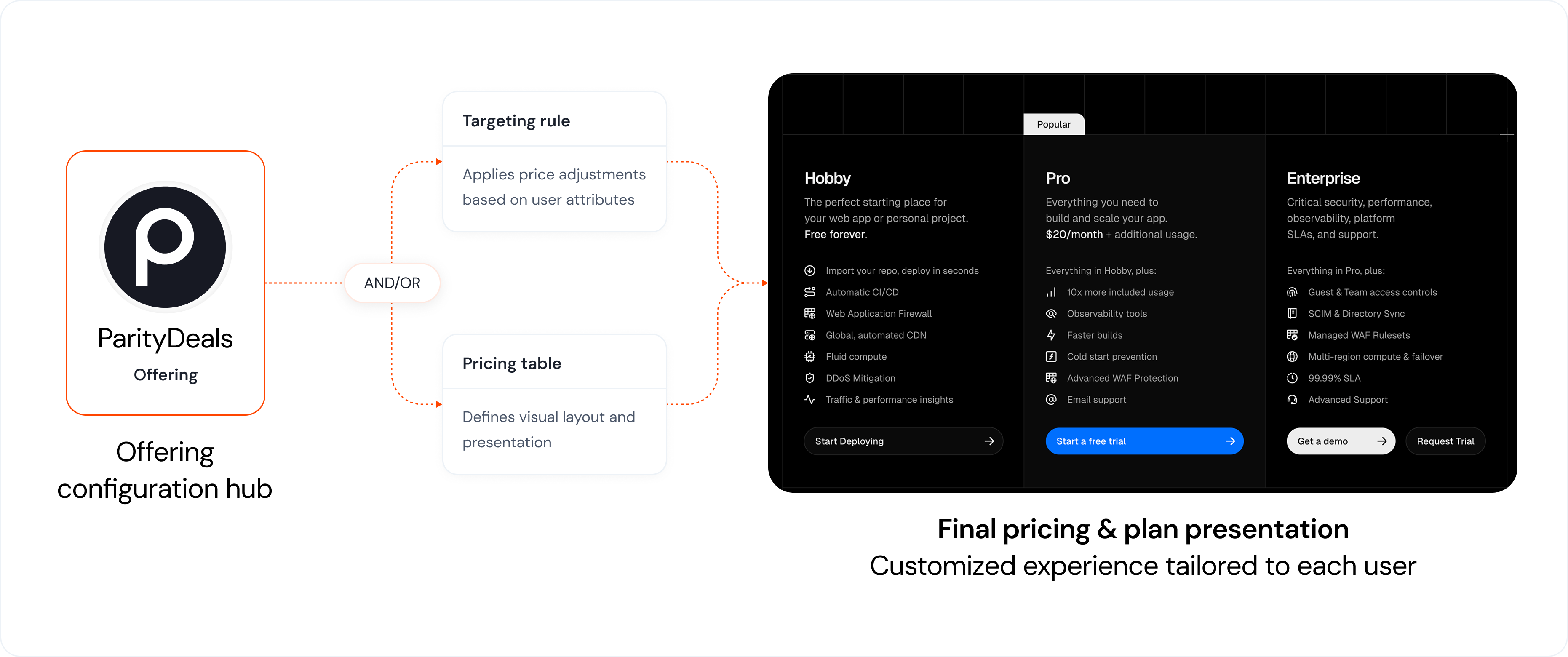 is implemented in your codebase, your product, marketing, or sales teams can change which Pricing table is displayed or which Targeting Rule is applied to that Offering directly from the ParityDeals dashboard. This requires no new code deployments for most updates. - Flexible Configuration: You can configure an Offering with: