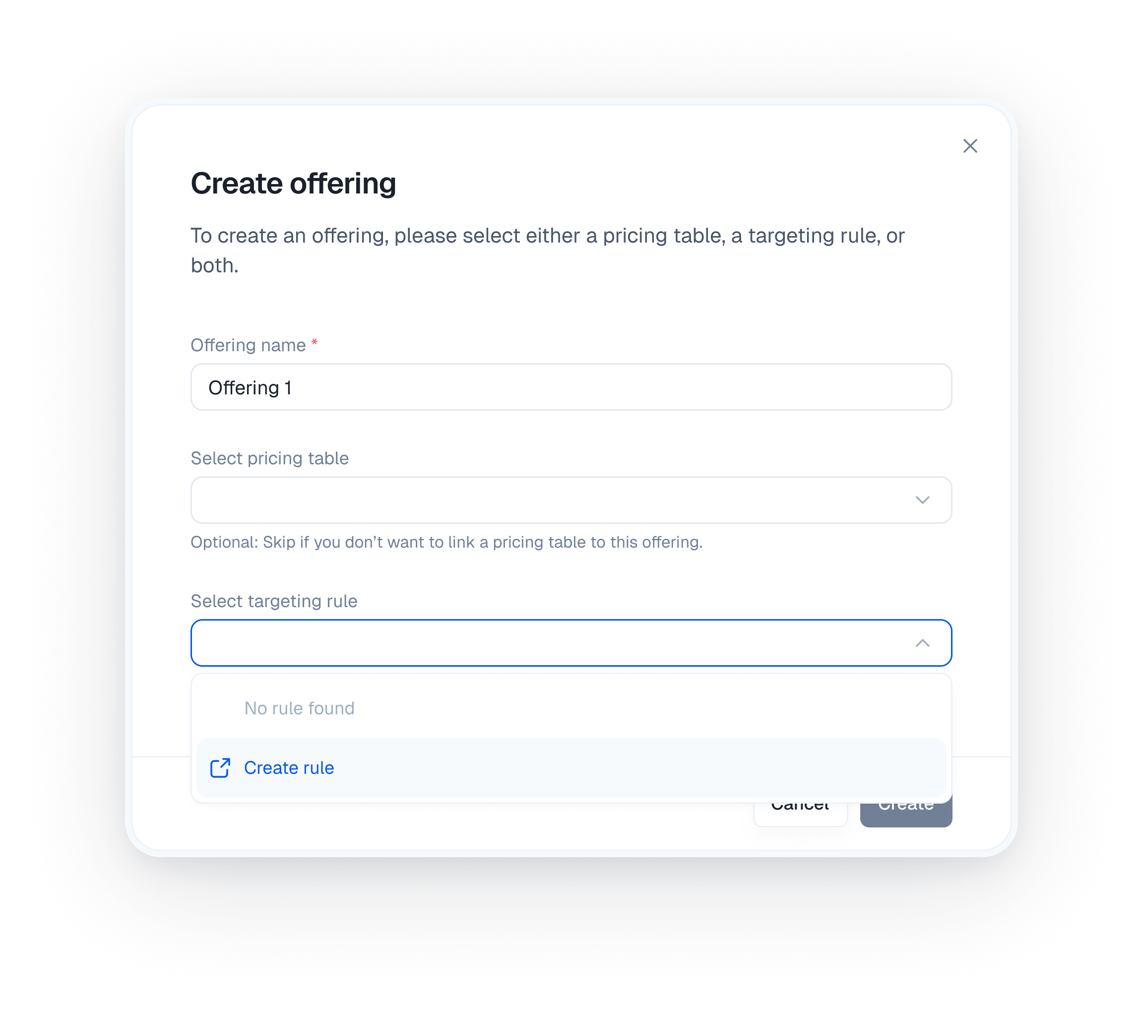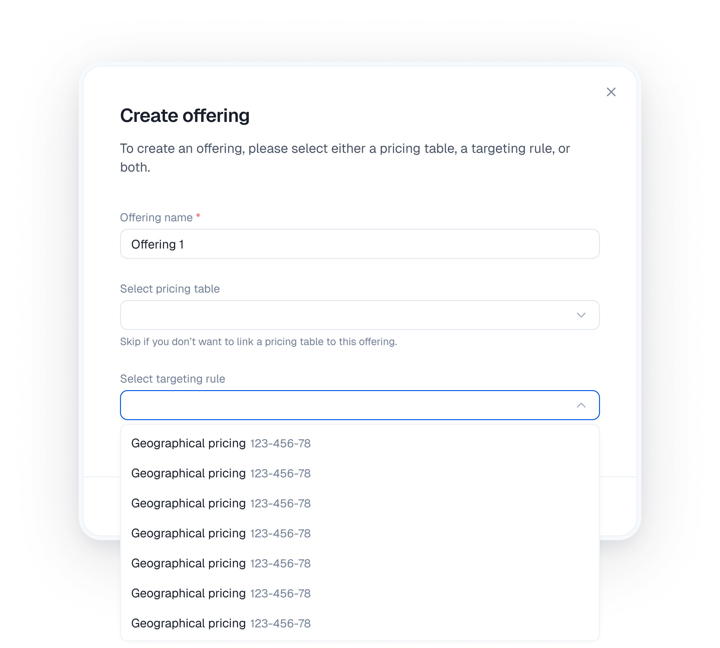 Targeting Rule Filtering: If you’ve selected a Pricing table, the available Targeting Rules in the dropdown will be filtered to only show rules that are associated with that specific Pricing table. This ensures consistency in your pricing strategy.