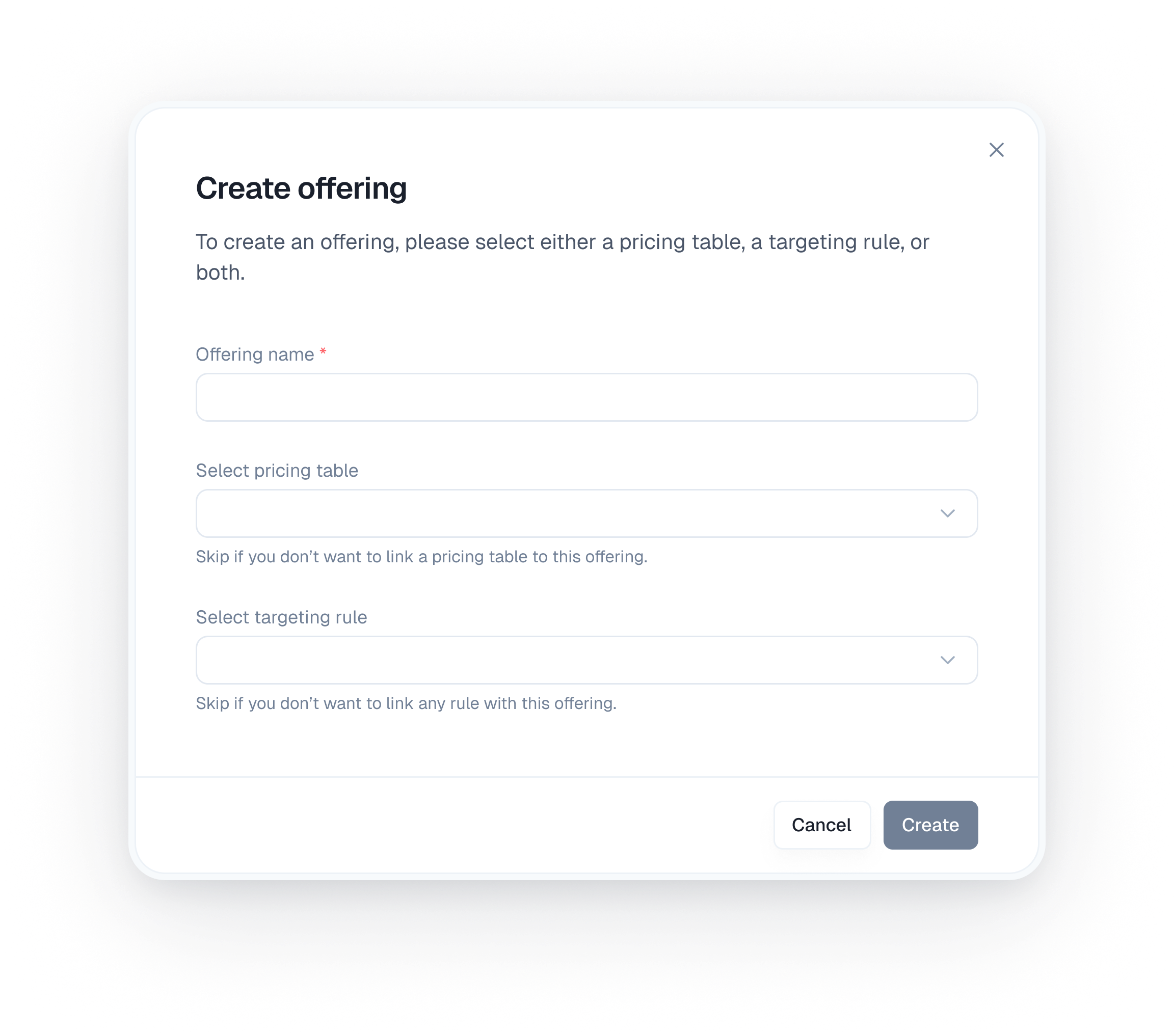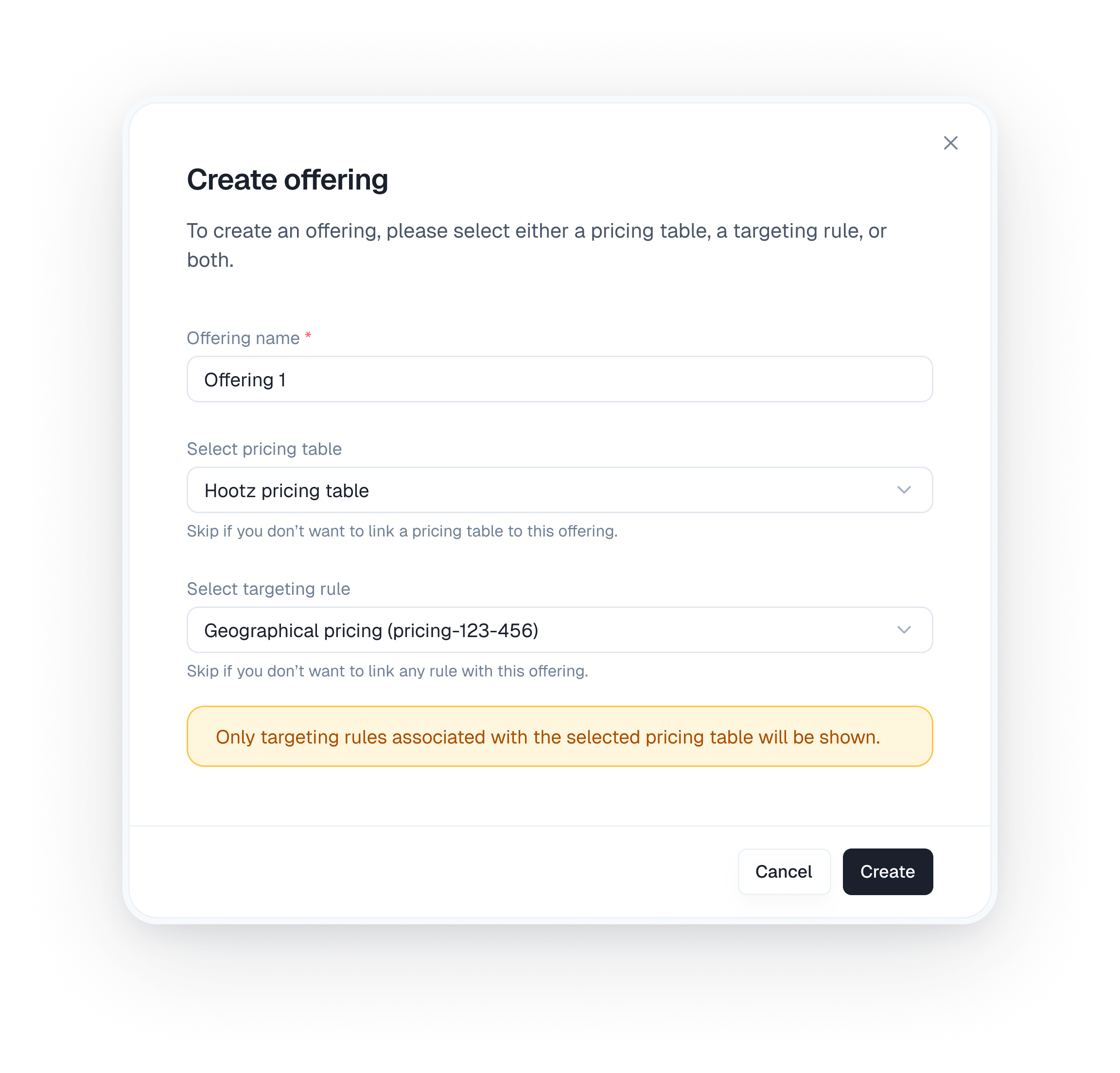 - Once you have configured the Pricing table (if any) and selected a Targeting Rule, click the “Create” button on the modal.