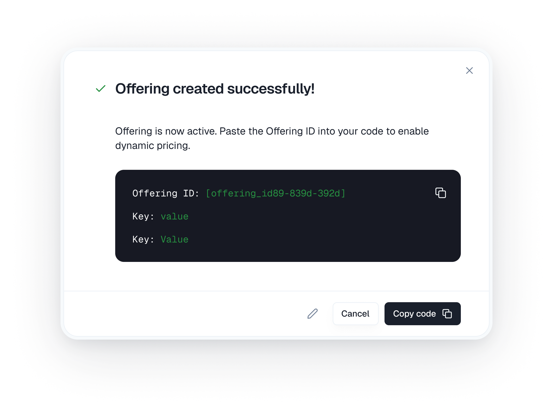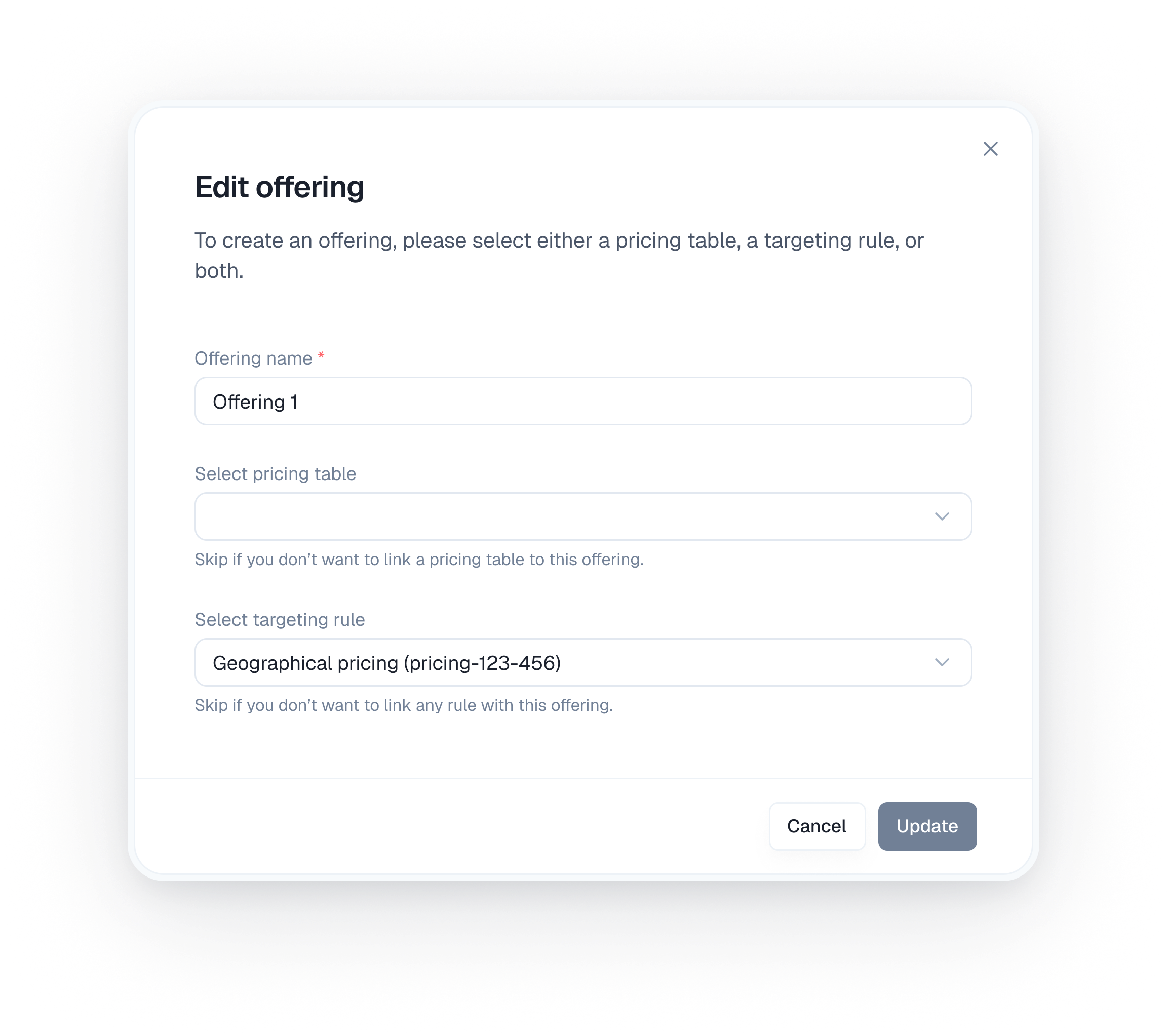You can modify an Offering at any time to change the Pricing table it displays or the Targeting Rule it uses. This is a powerful way to iterate on your strategy.