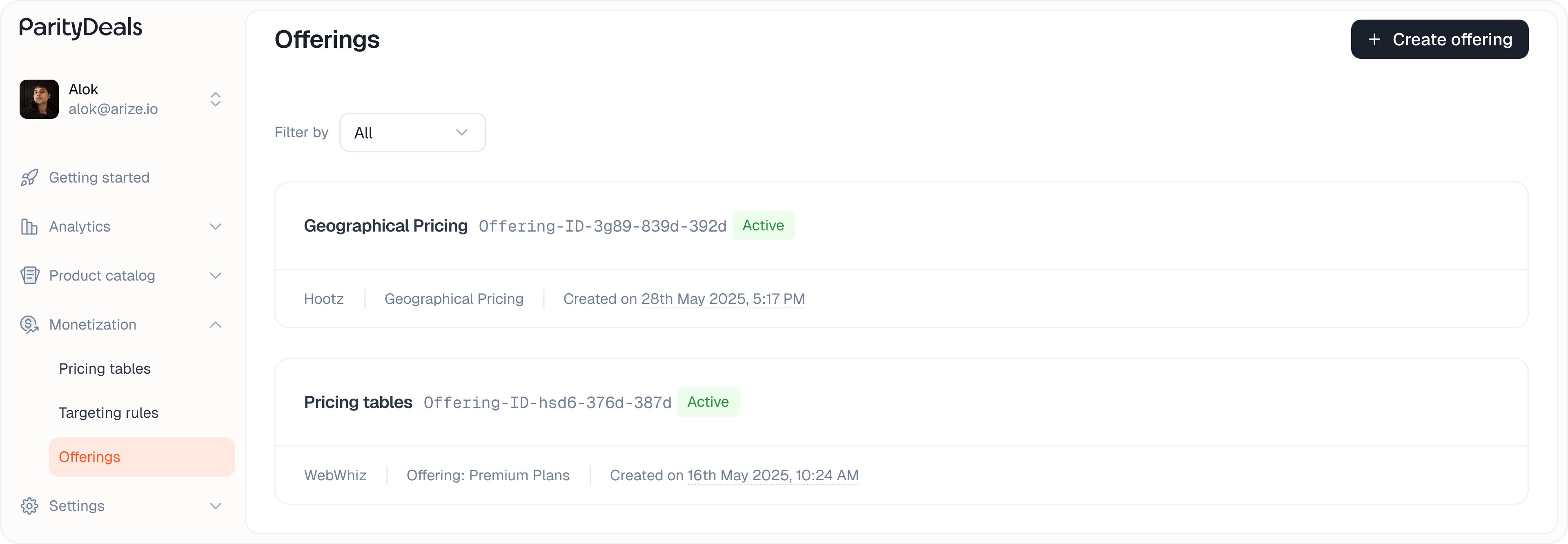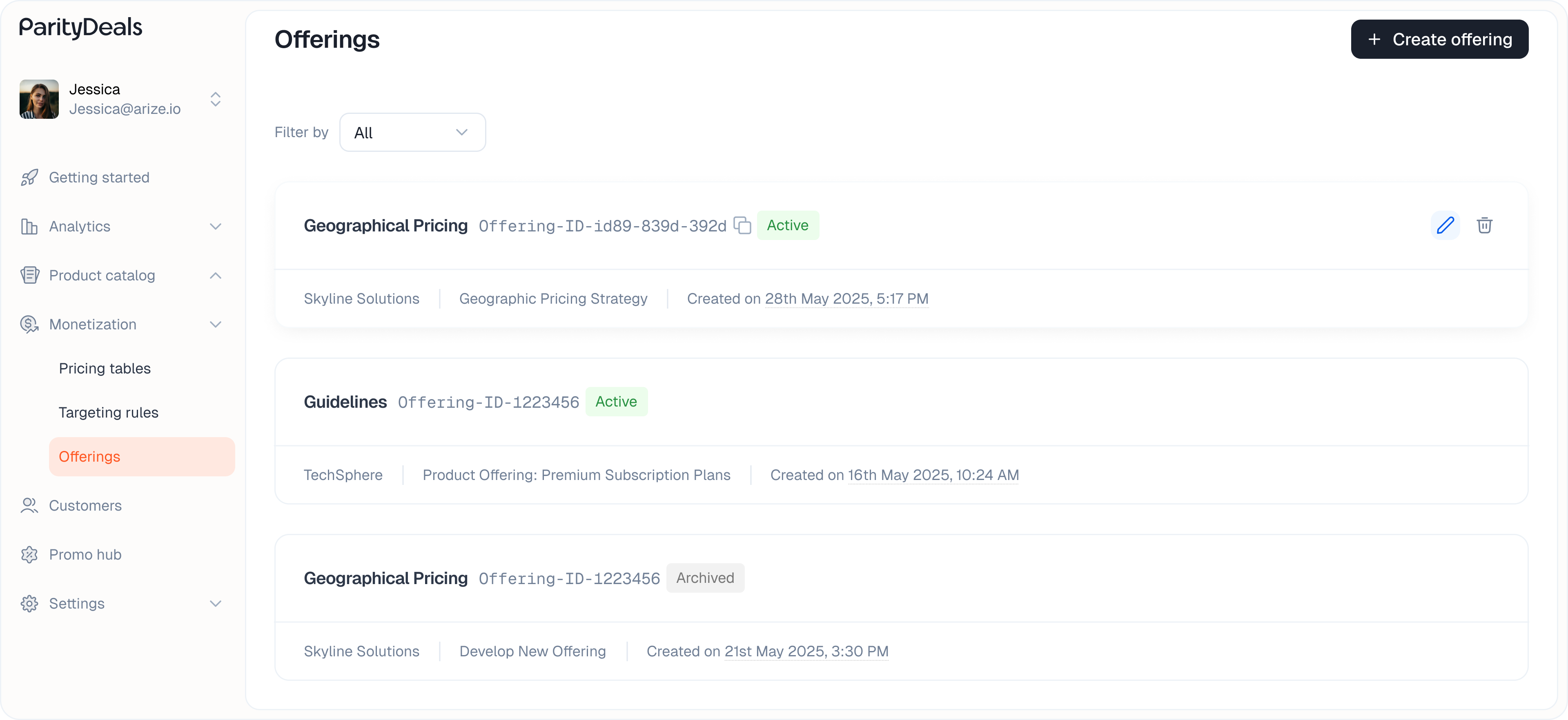 No Codebase Updates Needed for Most Changes! The Offering ID embedded in your application code remains the same. By editing the Offering in the ParityDeals dashboard (e.g., switching its linked Pricing table or Targeting Rule), you can instantly change the pricing and presentation your users see without requiring your engineering team to deploy new code. This empowers Product Managers, Go-To-Market teams, and Sales teams to iterate rapidly.