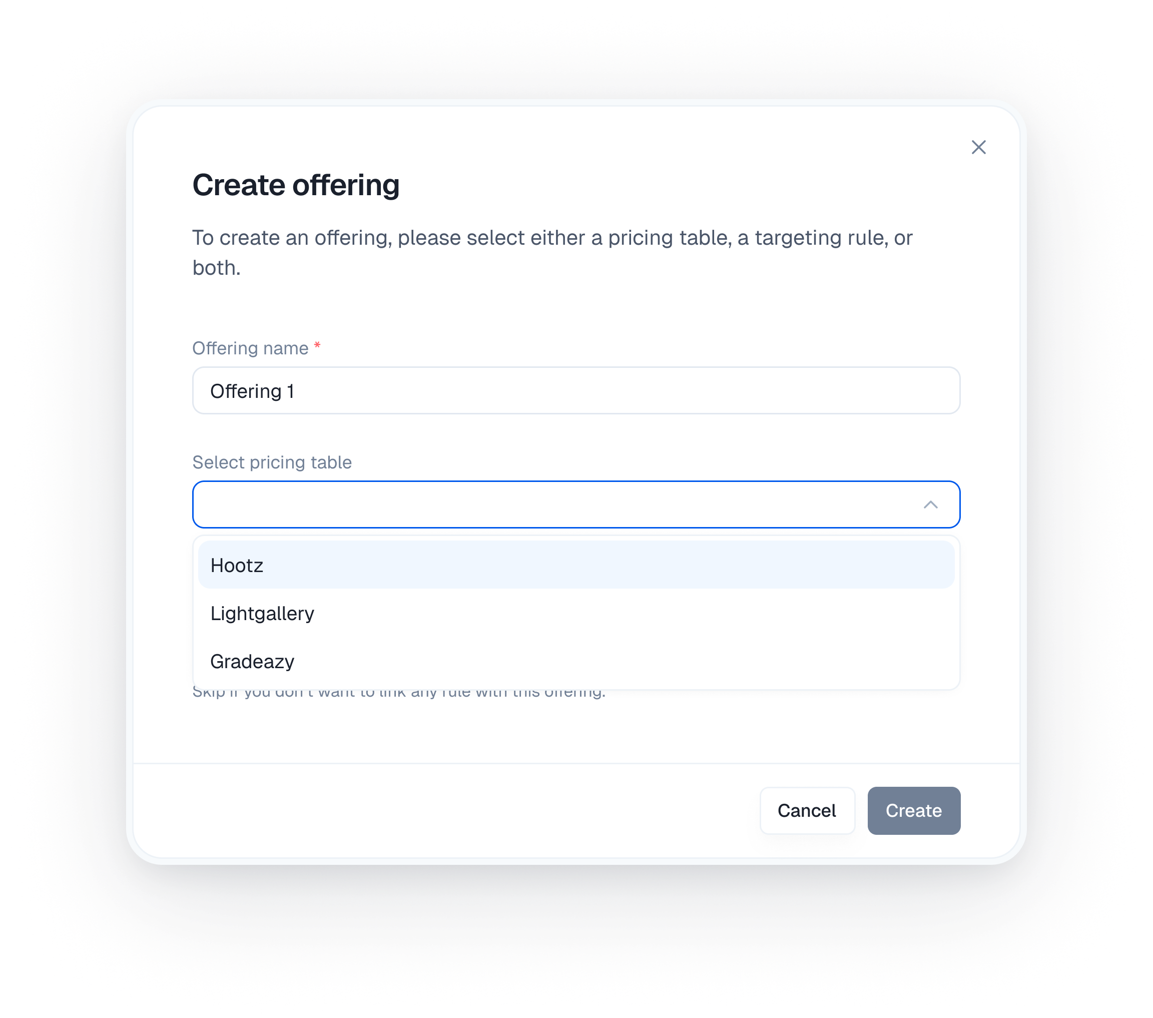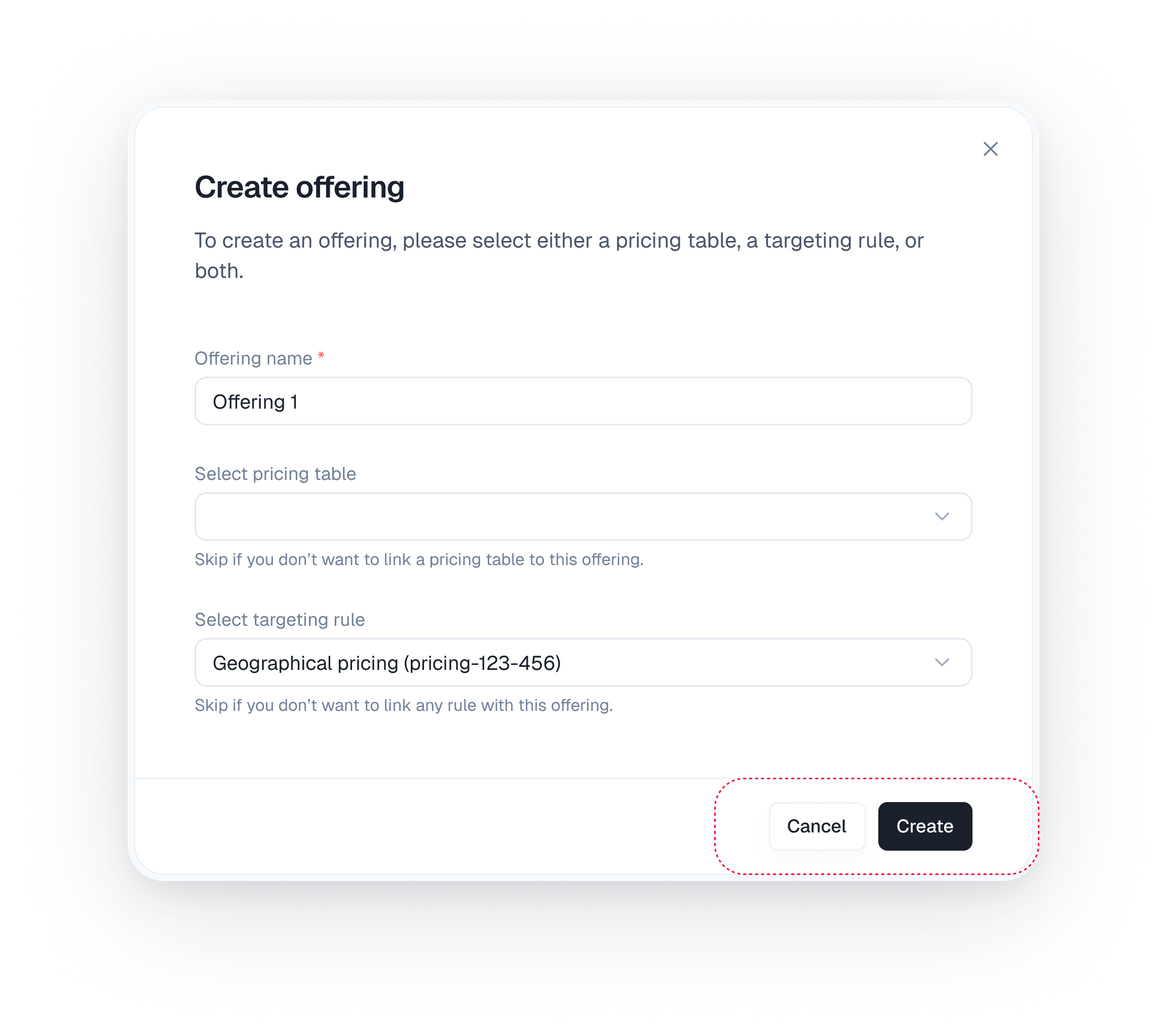 1. Once you have configured the Pricing table (if any) and selected a Targeting Rule, click the “Create” button on the modal.