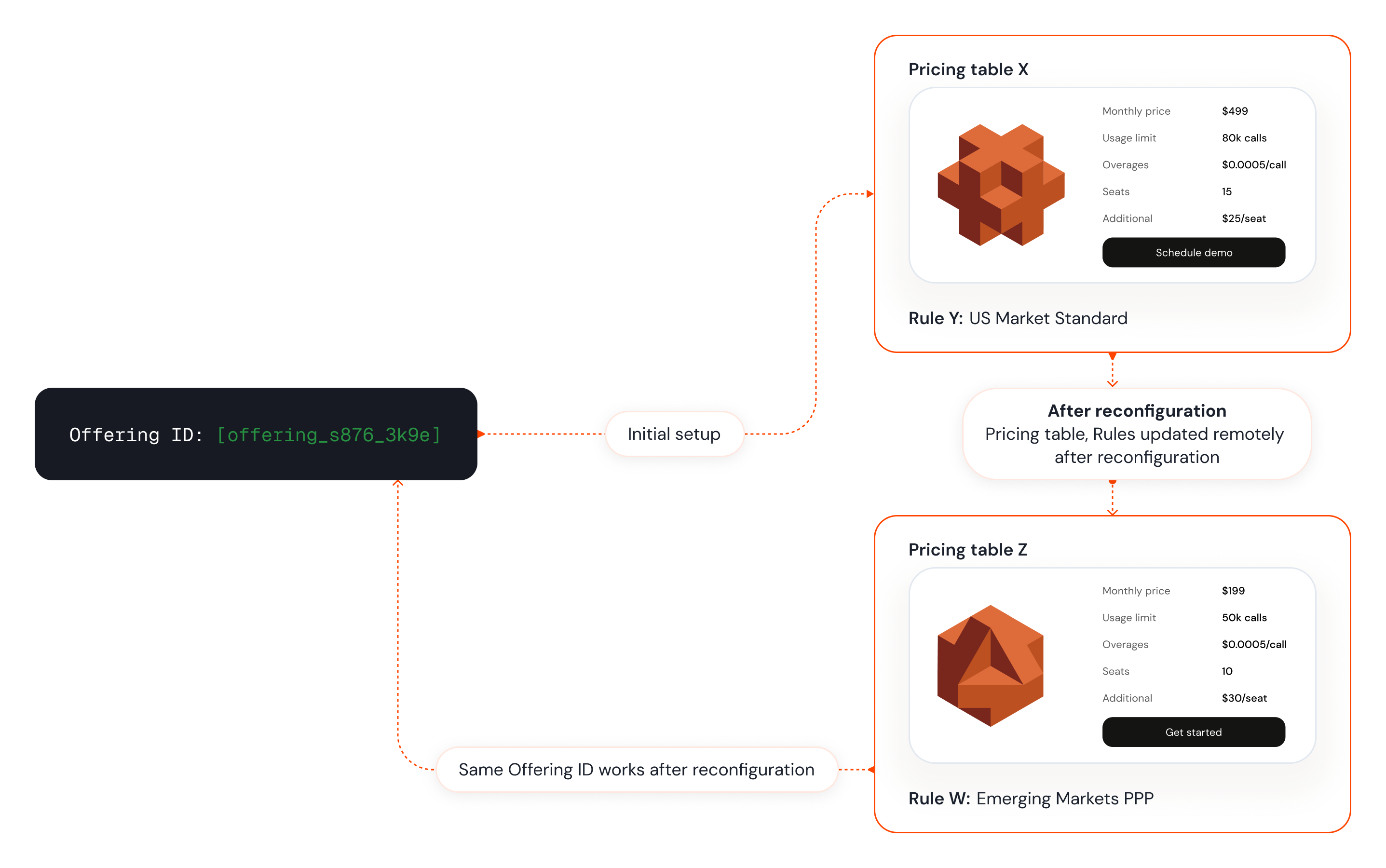 The Offering ID embedded in your application code remains the same. By editing the Offering in the ParityDeals dashboard (e.g., switching its linked Pricing table or Targeting Rule), you can instantly change the pricing and presentation your users see without requiring your engineering team to deploy new code. This empowers Product Managers, Go-To-Market teams, and Sales teams to iterate rapidly.