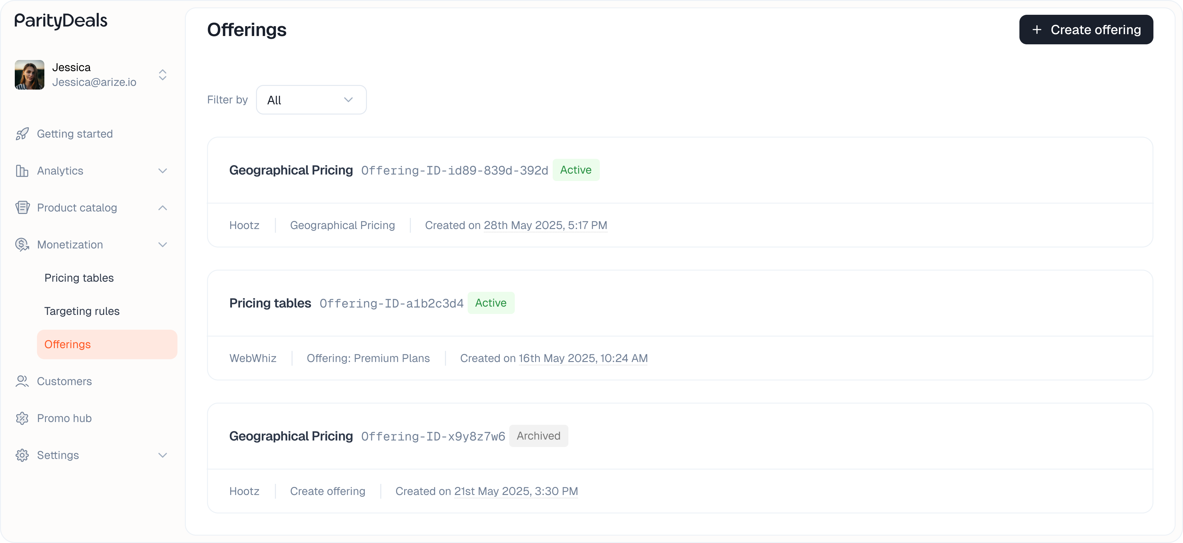 Navigate to Monetization > Offerings. The listing page displays all your Offerings, along with their statuses (e.g., “Active,” “Archived,” “Draft/Pending Changes”).