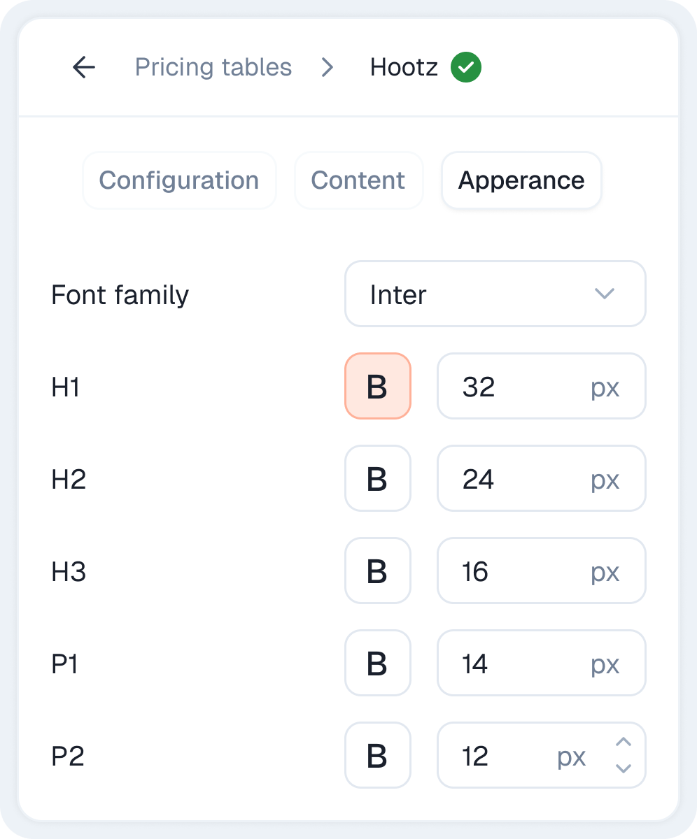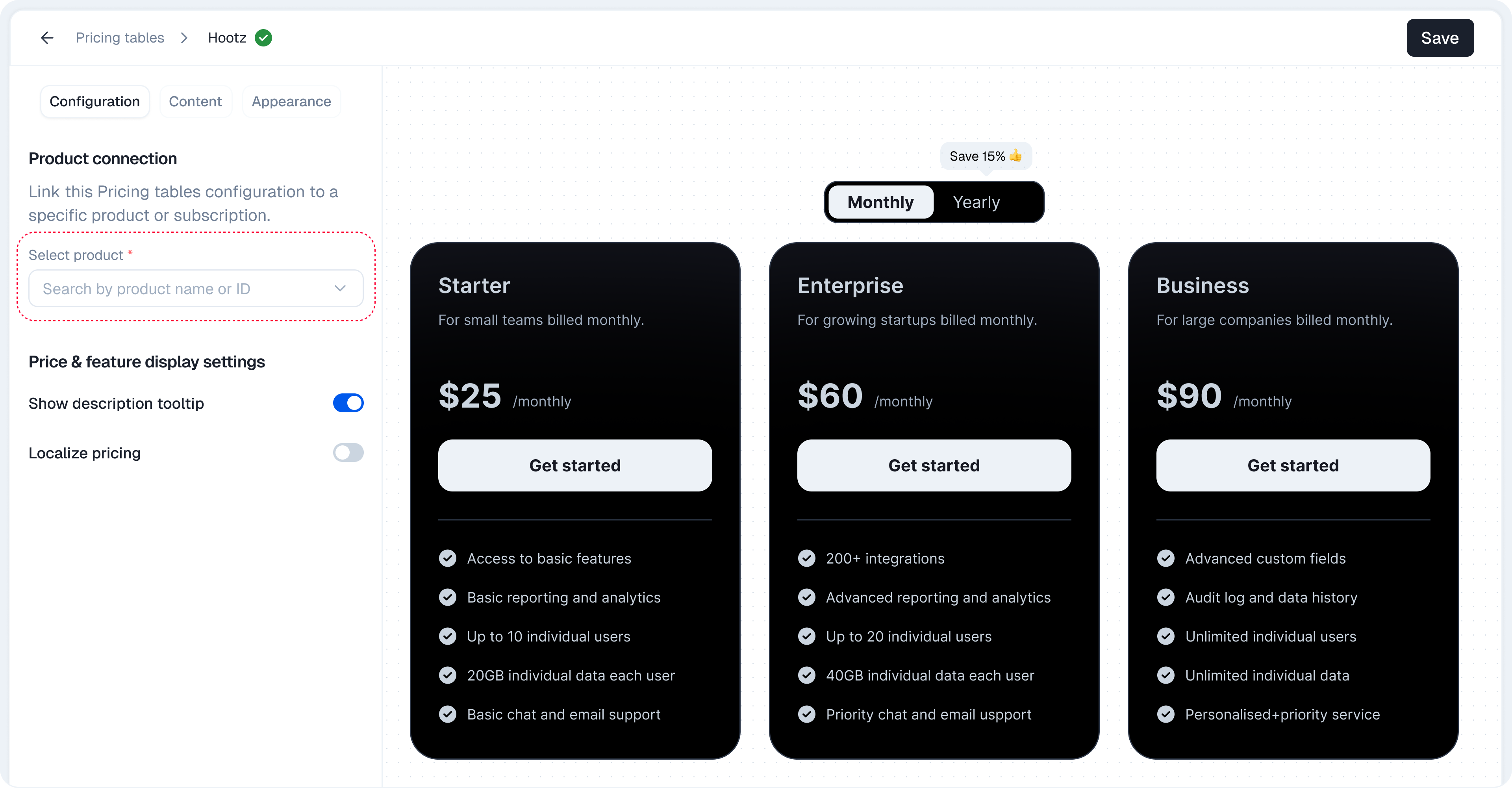 The Pricing table editor is your central hub for designing and configuring every aspect of your pricing table. It is organized into three main tabs: Configuration, Content, and Appearance.