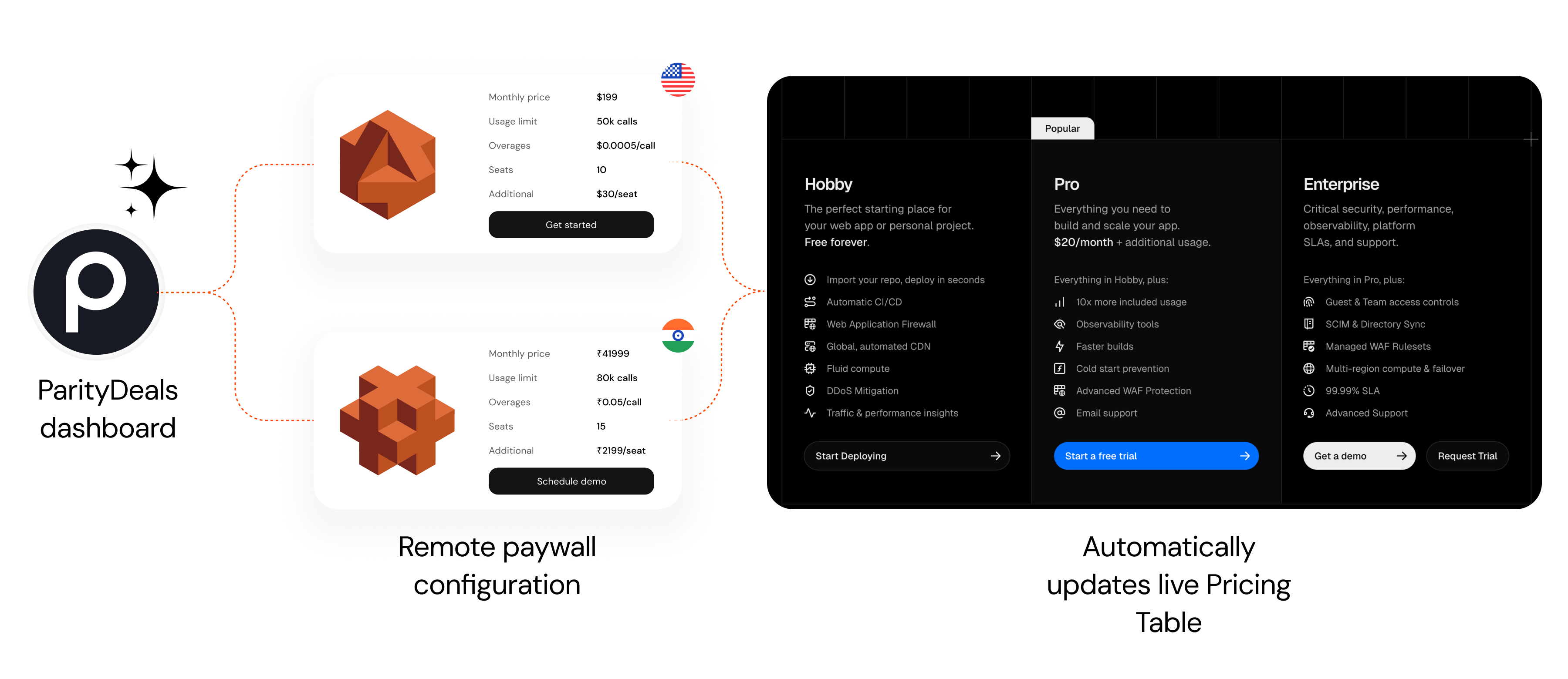 ParityDeals’ Pricing tables are dynamic, remotely configurable interfaces that present your pricing plans and features to your customers. They are the crucial touchpoint where users make subscription decisions. Our Pricing tables empower you to design, build, and deploy your entire pricing presentation—from simple pricing tables to complex, interactive subscription flows—directly from the ParityDeals dashboard, minimizing the need for code changes or app updates for most modifications. Key benefits include:- Remote Configuration: Update your pricing table’s appearance, content, and even the plans displayed, directly from the ParityDeals dashboard.