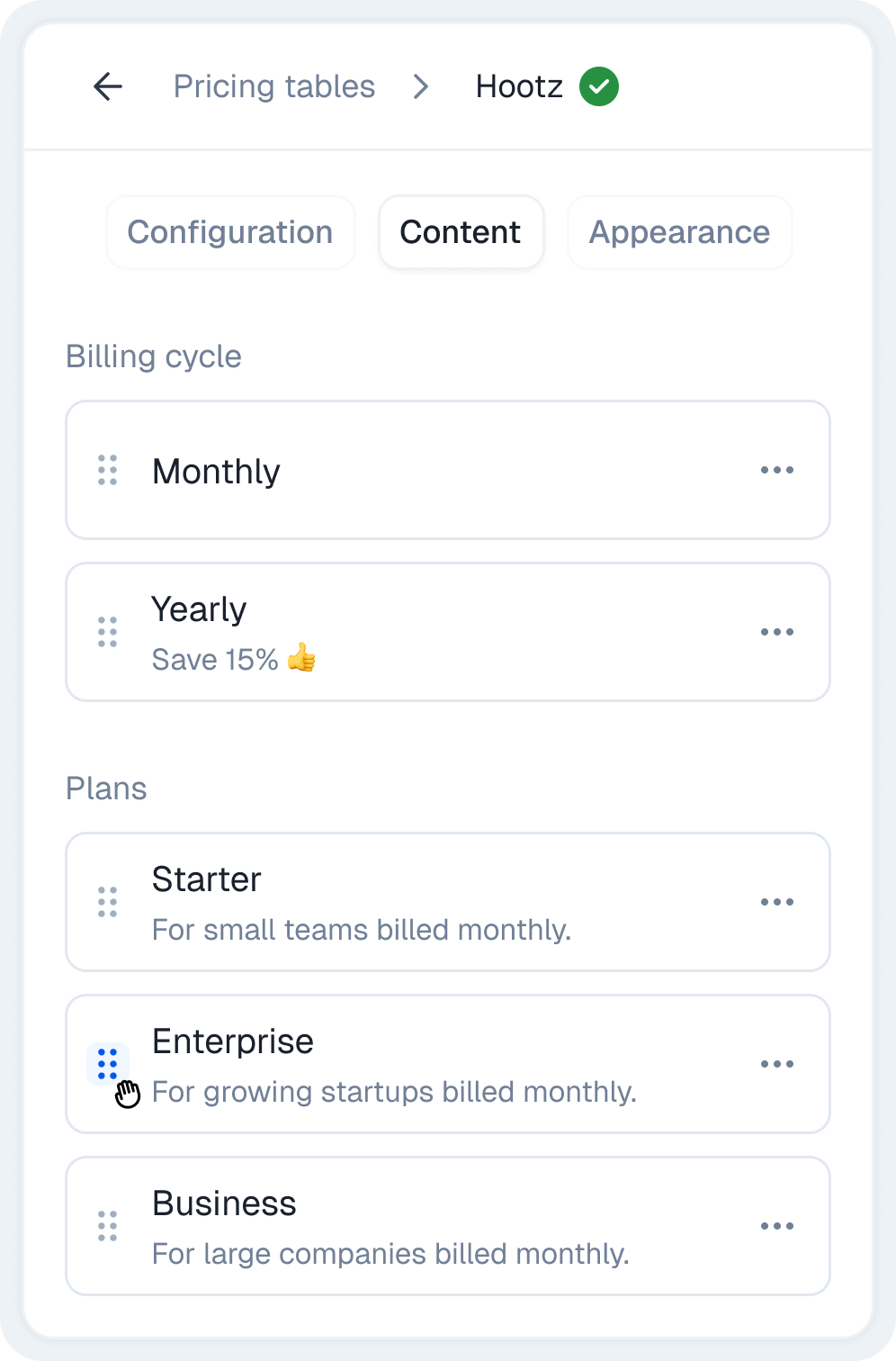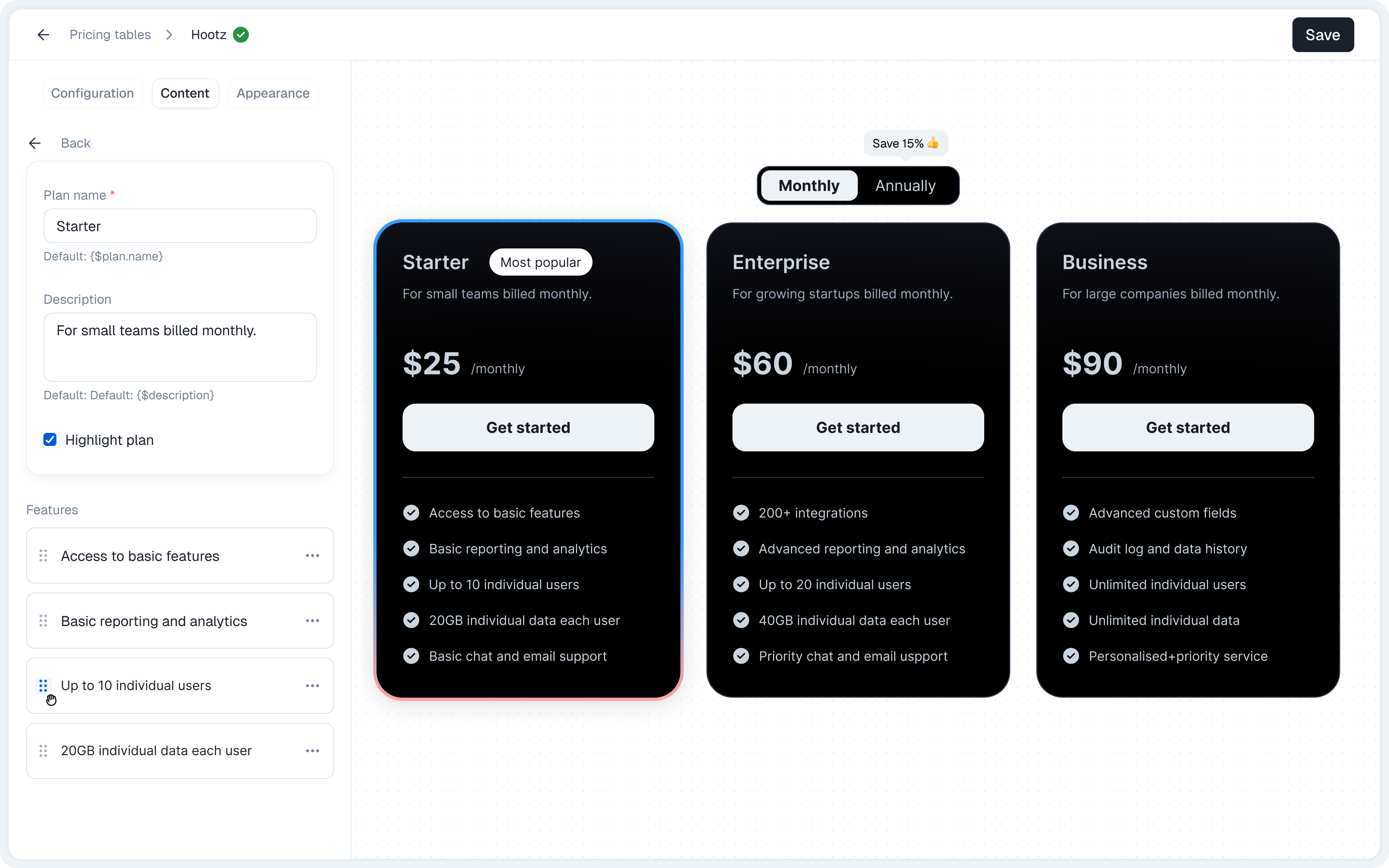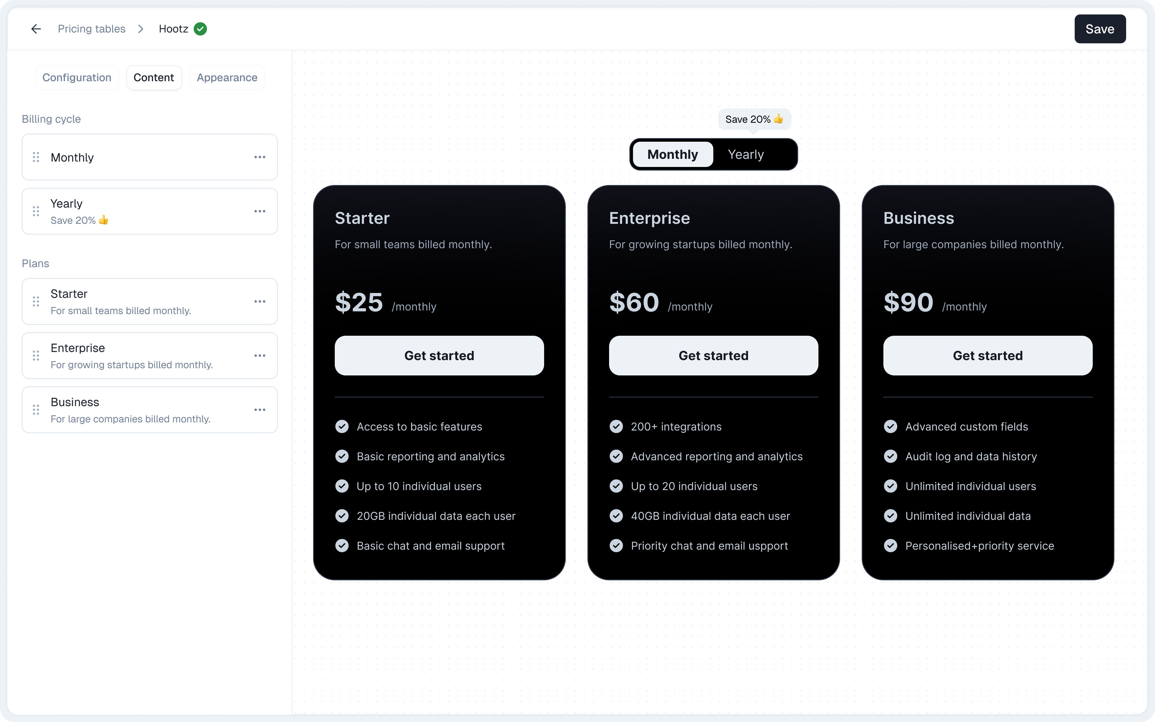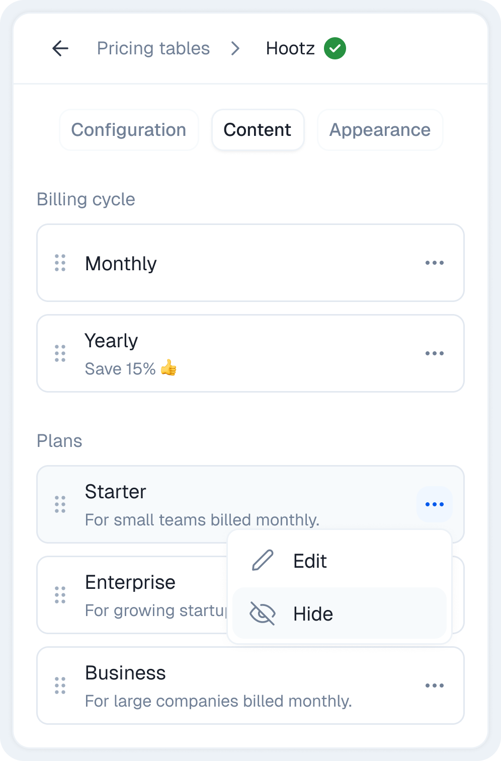 - Experimentation Ready: Easily A/B test different pricing table designs, plan presentations, and promotional content to optimize conversion.